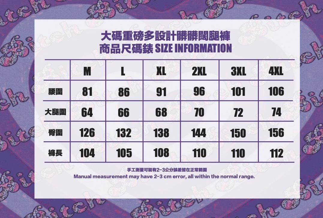 尺碼數據為手工測量2-4公分誤差