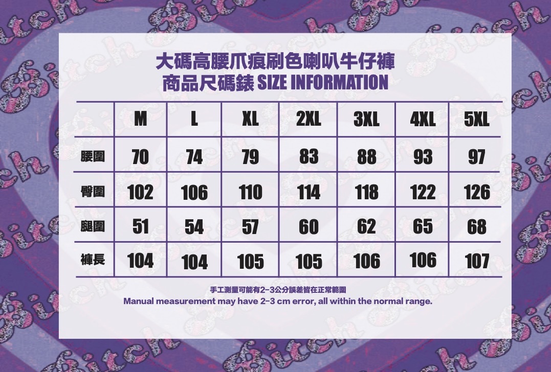 尺碼數據為手工測量2-4公分誤差